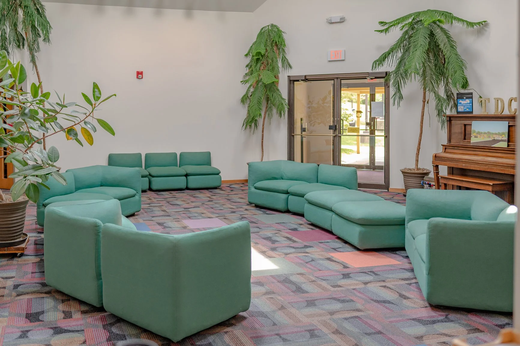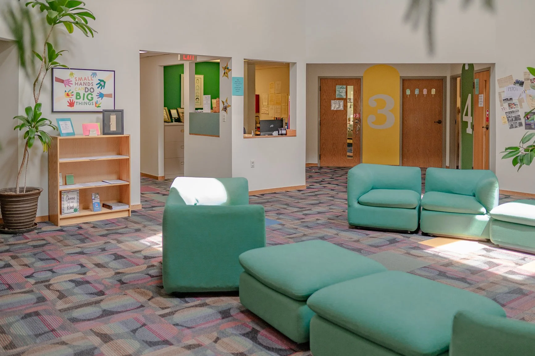 Our spacious lobby has tall cathedral ceilings with skylights but remains inviting. We host professionals who conduct enrichment activities such as music and story time in this community space. The lobby also serves as a location for special events for our children and their families.